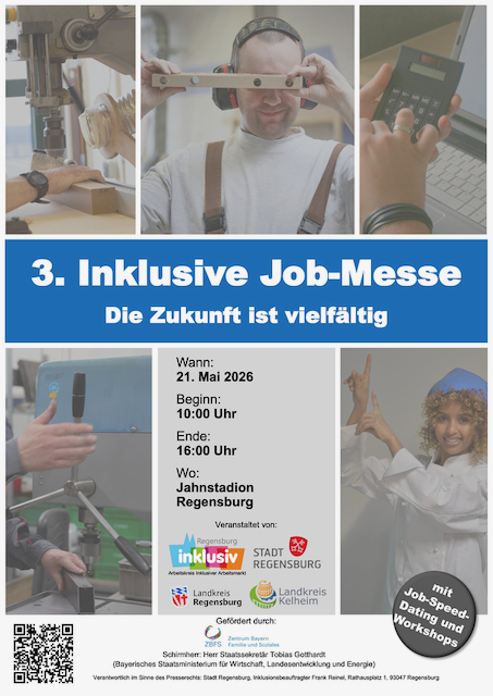 Der Arbeitskreis Inklusiver Arbeitsmarkt Regensburg plant zusammen mit der Stadt Regensburg dem Landkreis Regensburg und dem Landkreis Kelheim für Mai 2026 Regensburgs dritte „Inklusive Job-Messe“ – Informations- und Begegnungsmesse rund um die Beschäftigung von Menschen mit Behinderung.